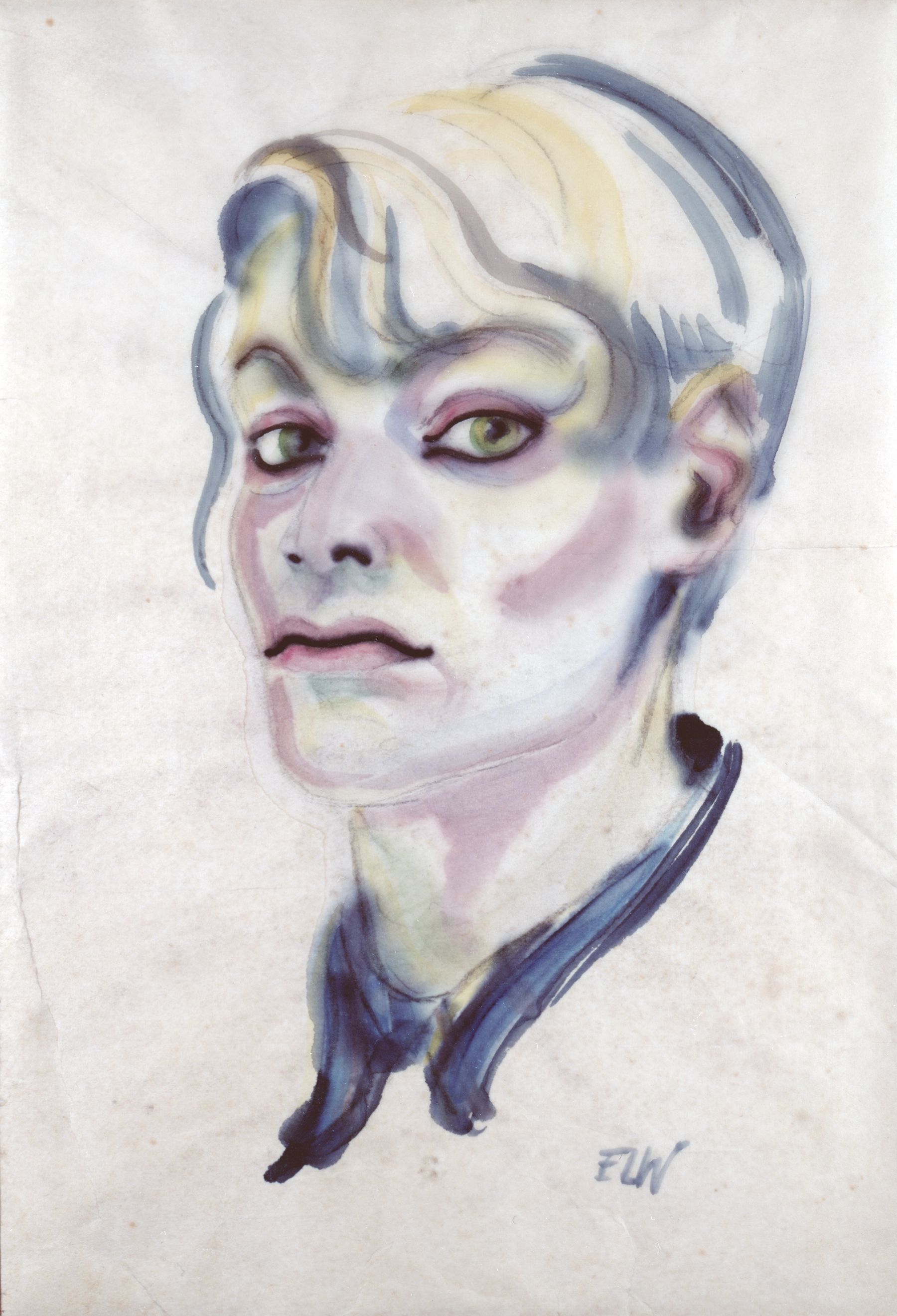 Selbstporträt mit blauem Kragen (1925) zeigt sie sich als selbstbewusste junge Frau. Im so sicheren dynamischen Setzen der Bildmittel erscheint hier bereits alles präsent, was ihre Arbeitsweise zukünftig auszeichnen wird. Elfriede Lohse-Wächtler blickte optimistisch in die Zukunft.