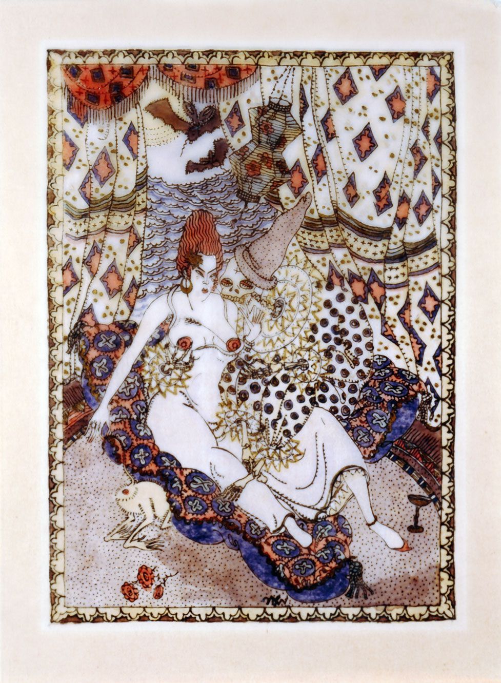 Gemeinsam mit Londa von Berg, der späteren Ehefrau Conrad Felixmüllers, teilte sie sich ab Herbst 1916 ein Zimmer unweit der Kunstgewerbeschule und der Akademie. Voller Tatendrang stürzte sie sich nun in ihr neues selbständiges Leben, legte sich ein männliches Pseudonym zu und signierte ihr Werke fortan mit Nikolaus Wächtler. Und sie tanzte. In ihrer Begeisterung für den modernen Ausdruckstanz gehört sie einer ganzen Generation von jungen Frauen an, die über ihren Körper ein völlig neues künstlerisches Ausdrucksfeld für sich entdeckte, das nicht von Männern besetzt war. Als die damals erfolgreiche Solotänzerin Gertrud Leistikow (1885-1948) die Räume der Kunstgewerbeschule für ihre Tanzschule nutzte, gehörte Elfriede Lohse-Wächtler zu ihren ersten Schülerinnen und nahm an Tanzaufführungen teil. (Jacobien de Boer) 1917 erstellte sie gar eine druckgrafische Mappe mit Tanzstudien, die Leistikow einem bedeutenden Tanzkunstexperten der Zeit zum Abdruck anbot. Das offen „Exotistische“, das den modernen Tanz in dieser Zeit in Themenwahl und modischer Inszenierung prägte, fand in ihren Batikarbeiten ebenso sein Echo wie in der in kleinteilige Flächenornamente gebetteten Motivwelt ihrer handkolorierten Federlithografien, wie Tod und Sünderin (1918) und Salome (1918). Diese entstanden nun vermehrt auch im Auftrag und bildeten neben den Batiken eine weitere Einnahmequelle.