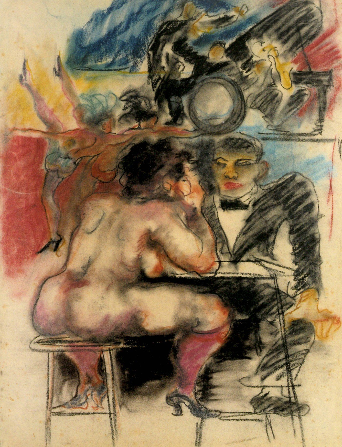 Und auch die wenigen weiblichen Künstlerinnen, die sich zu jener Zeit in diese Männerdomäne vorwagten – wie beispielsweise Jeanne Mammen oder Elsa Haensgen-Dingkuhn – tauchten nicht derart tief ein. Die expressiven, mutigen Pastelle, Aquarelle und Zeichnungen zeigen den Alltag im Bordell hinter den Kulissen – vom geschäftsmäßigen „Smalltalk“ über den schönen Schein der Show bis hin zu den regelmäßigen ärztlichen Untersuchungen, denen sich die Frauen unterziehen mussten. Zur Untersuchung (1930)