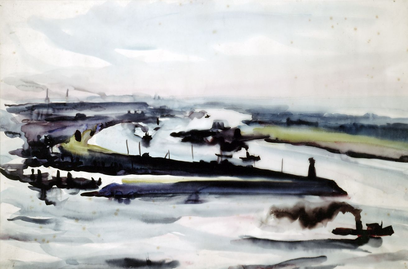 Daneben malte Elfriede Lohse-Wächtler in dieser Zeit zahlreiche atmosphärische Ansichten von Hamburg. Obgleich zeitgenössische Ausstellungskritiken Ölgemälde erwähnen, sind auch von diesen Darstellungen vor allem Arbeiten auf Papier erhalten geblieben. Der Köhlbrand (1930)